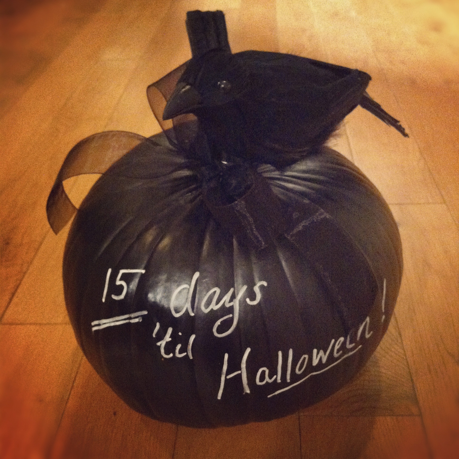 I am trying out some new Halloween projects this year, and here’s one of them. Such an easy craft, I spray painted a pumpkin with chalkboard paint, embellished with black ribbon and a spooky bird, and wrote my message with a chalkboard pen. This cool countdown-to-Halloween pumpkin is going to look perfect on my front porch!